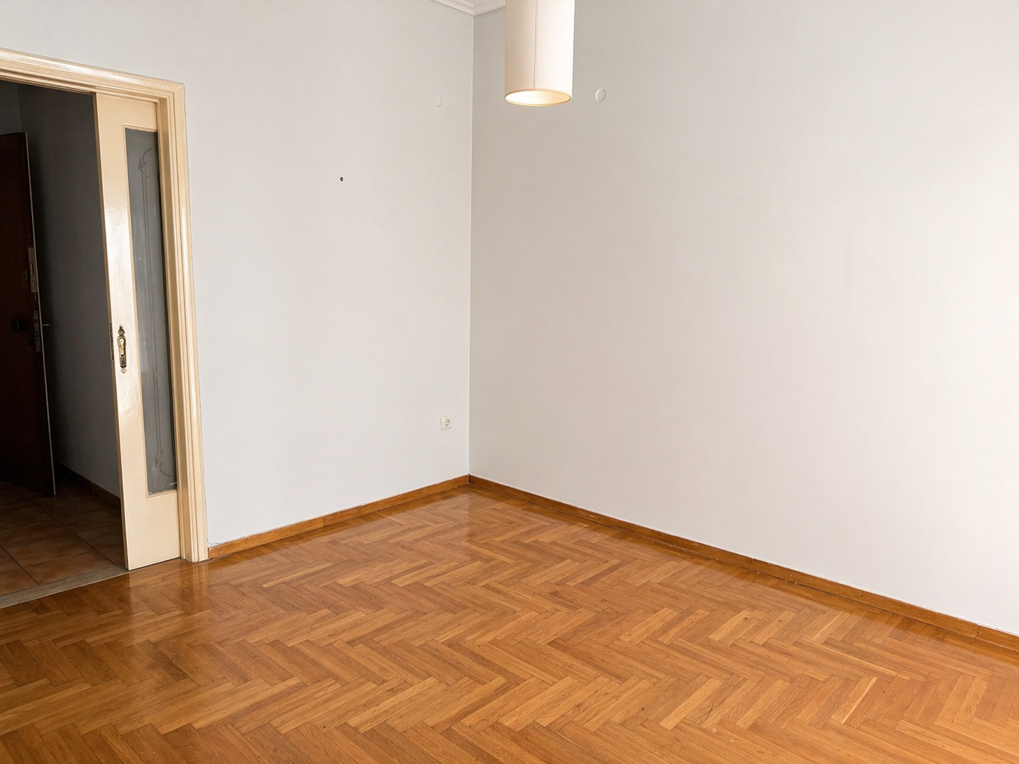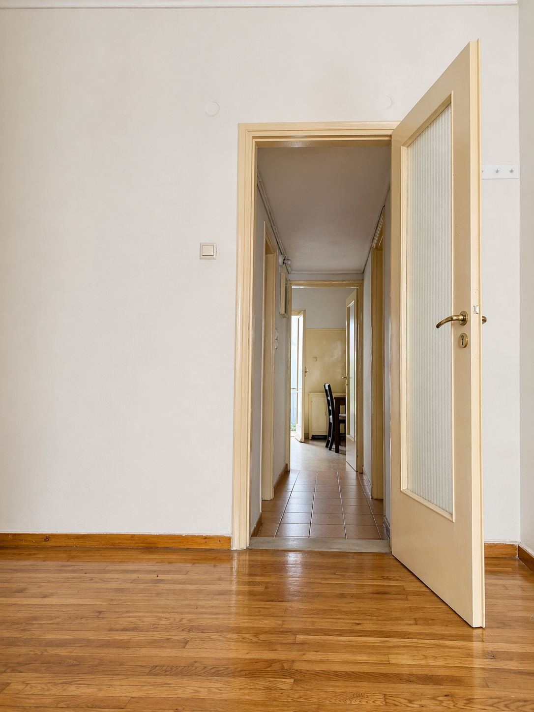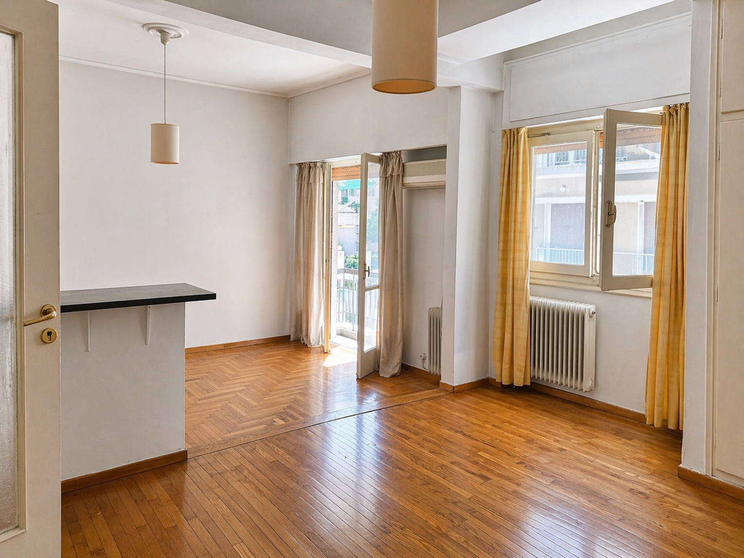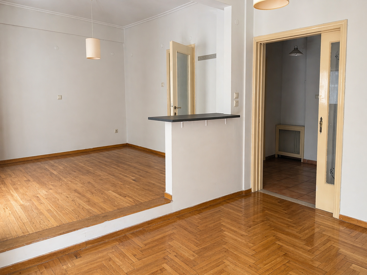 I am selling a 59 square metre apartment on the elevated ground floor of a solid building in Kato Patisia, central Athens. It is vacant and available for immediate handover.