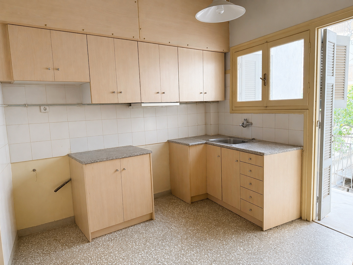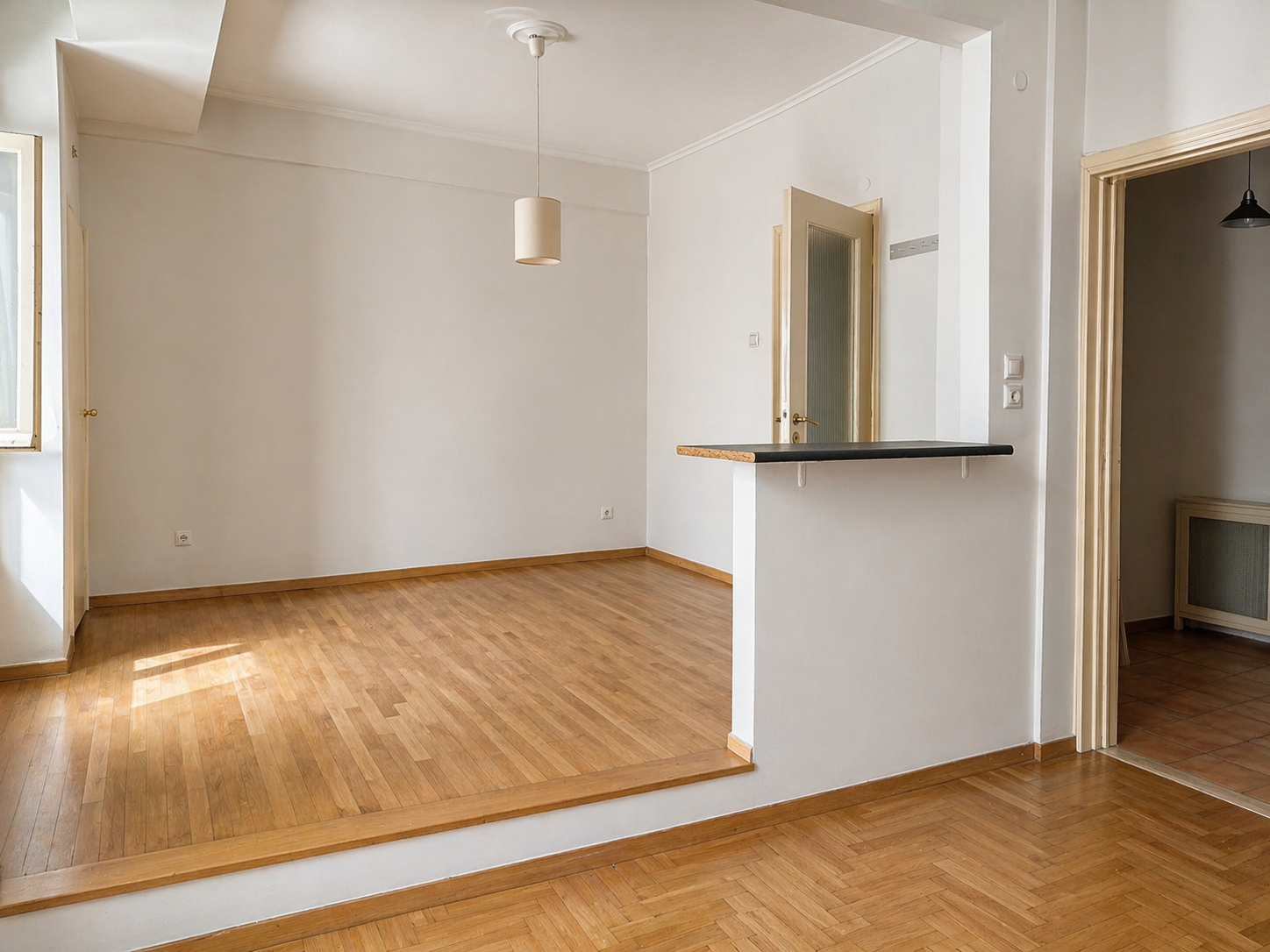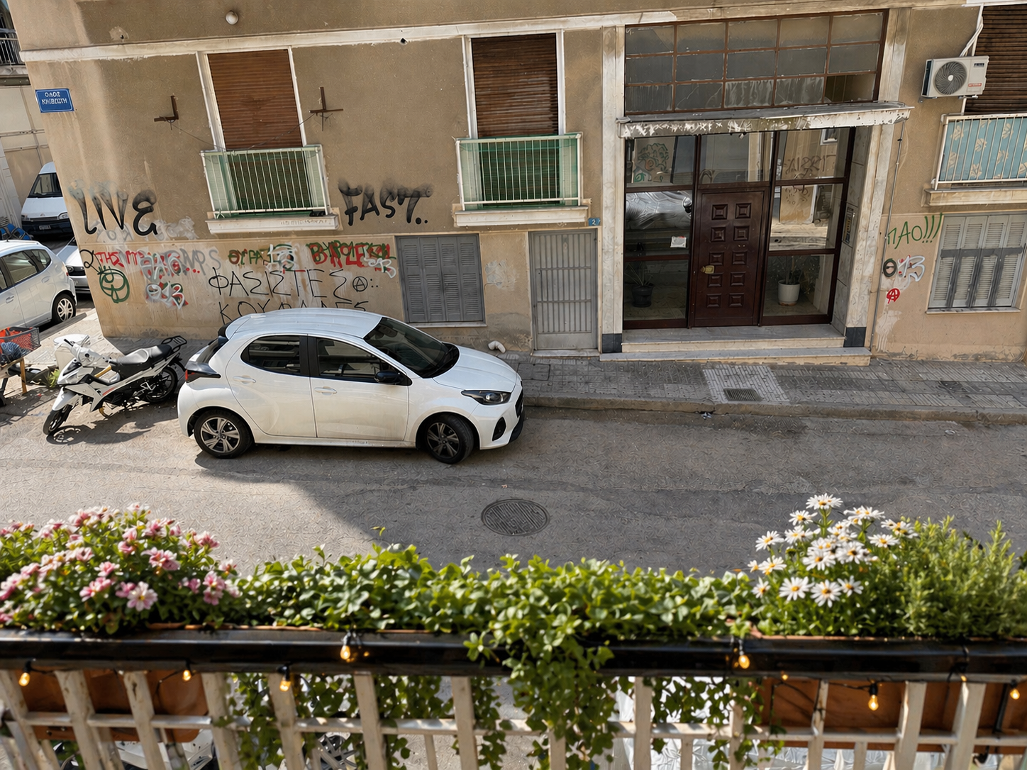 I am selling a 59 square metre apartment on the elevated ground floor of a solid building in Kato Patisia, central Athens. It is vacant and available for immediate handover.