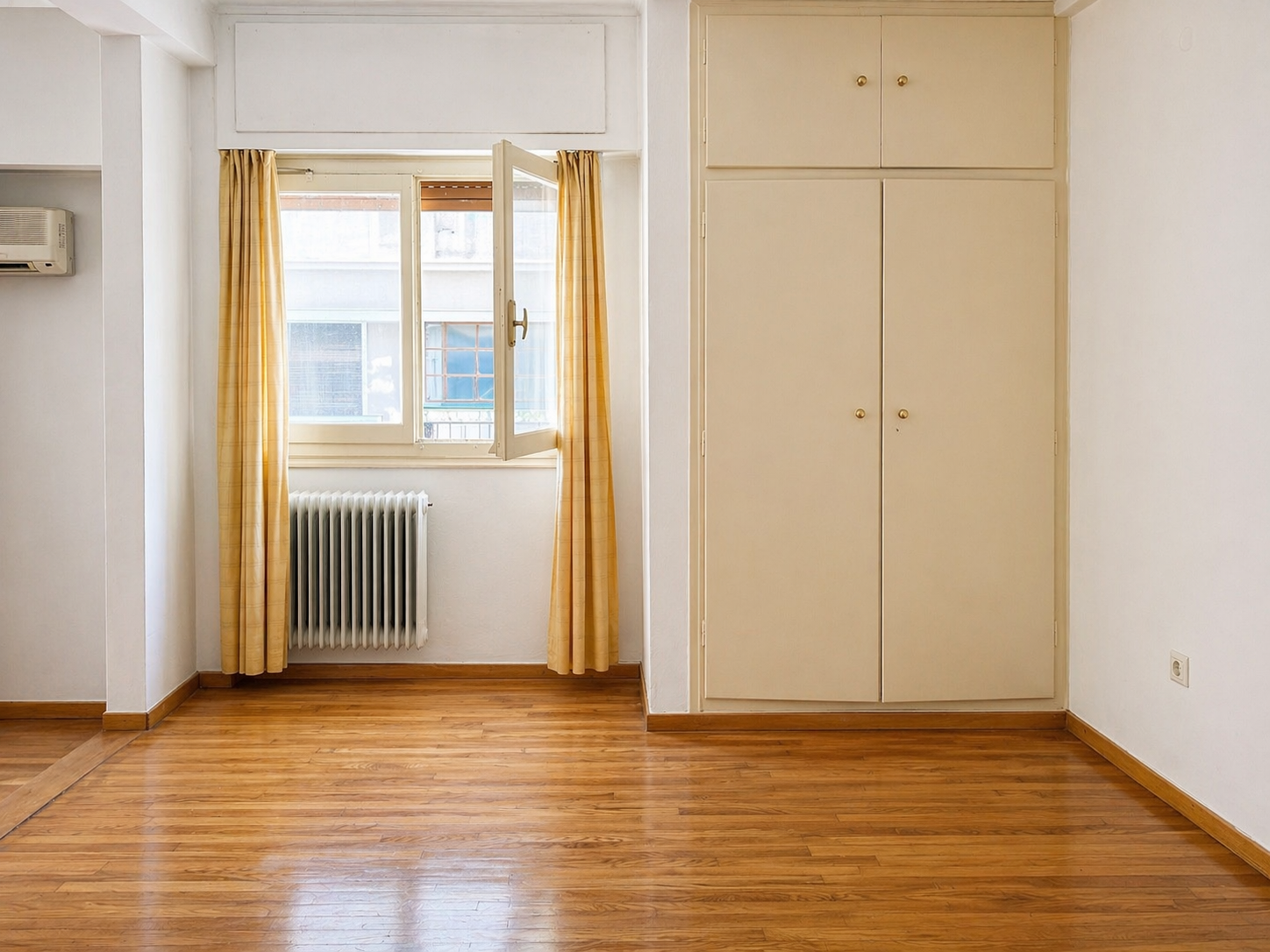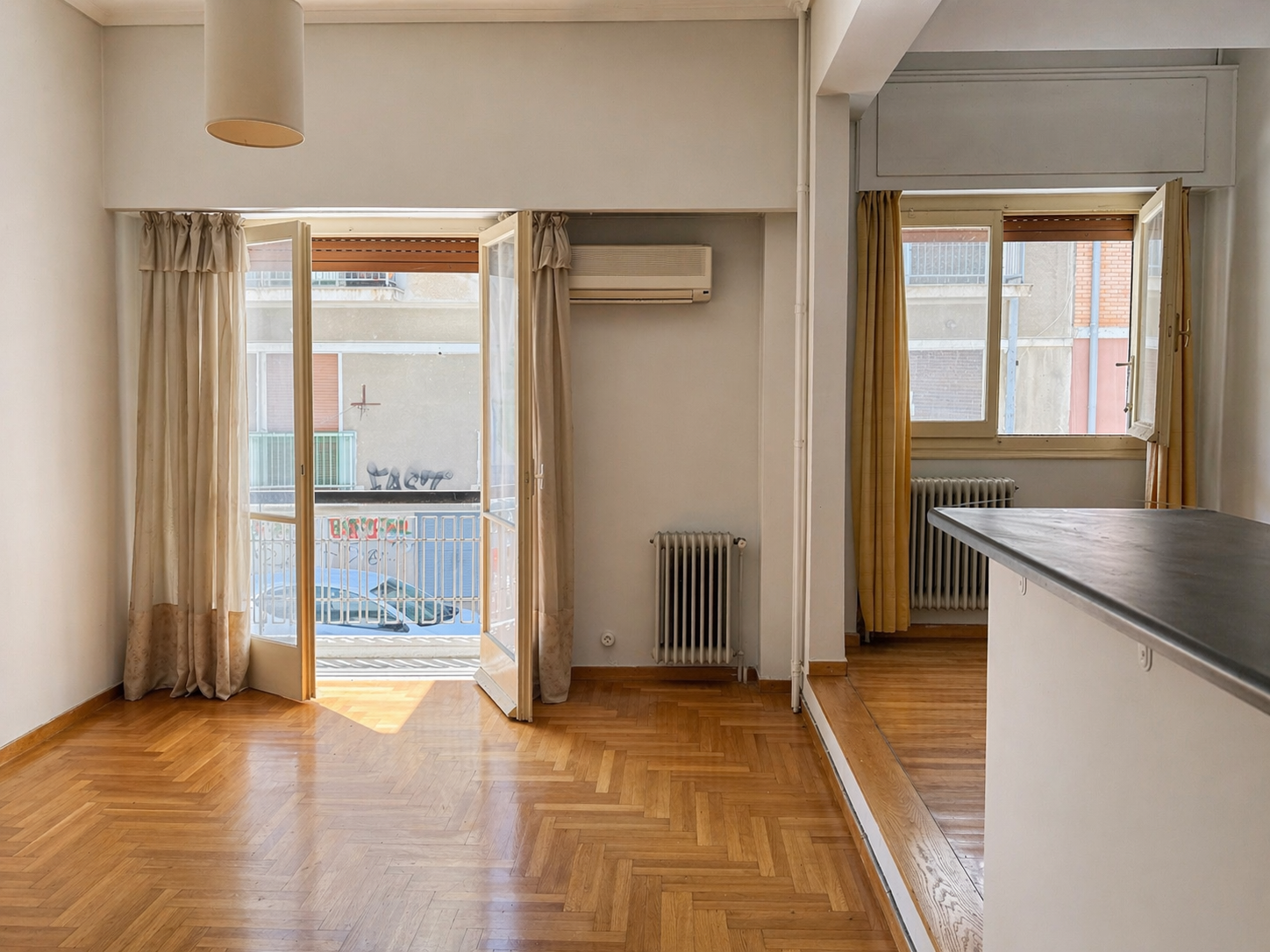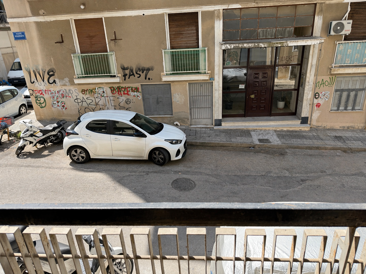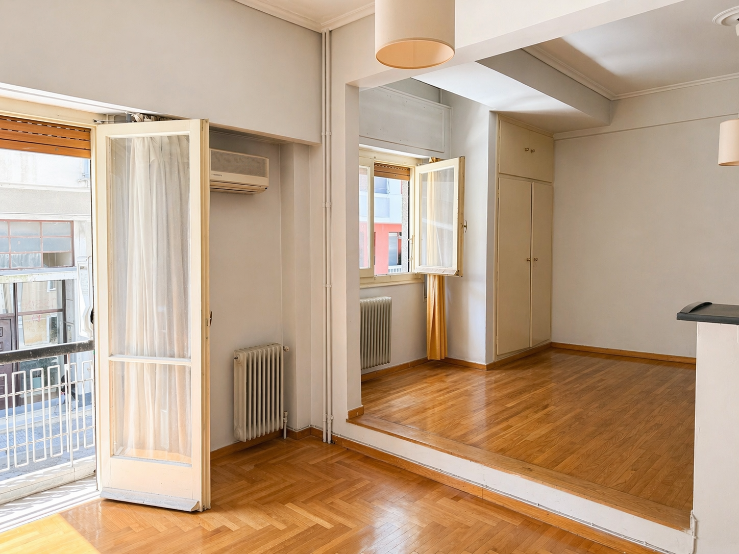 I am selling a 59 square metre apartment on the elevated ground floor of a solid building in Kato Patisia, central Athens. It is vacant and available for immediate handover.